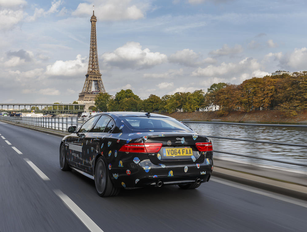 British style of two different fields blends and get off to Paris: fashion by Stella McCartney dresses the new Jaguar XE (we had already talked about it here) with the fantasies of her Superhero collection. It happened during Paris Fashion Week, for one day only. Just befor McCartney’s fashion show the Jaguar have zipped through the streets of the Ville Lumière for an original collaboration, an idea which was wondering in Ian Callum’s, Jaguar Director of Design, head since Stella McCartney designed the clothing for the Olympics of the British team, following the values common to the two brands: elegance, style, functionality.