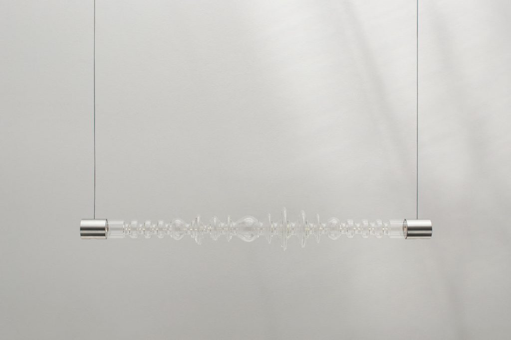 From the first sketch to the final result, Marta Alonso and Imanol Calderón are thinking to the soul of the materials they use. Whether they are focused on product design or architecture, first and foremost they have respect for the soul of the material, its history, its functionality. Only in this way can a design express its own, well-defined personality. They are then the result of teamwork, working closely with the client, as a collective that draws strength from sharing and plurality. In 2015 they were awarded the Special Mention by Architizer A+Awards and Best Young Spanish Designer by Elle Décor. Marta and Imanol have fallen under the spell of artisan mastery.The essence of Mayice Studio projects is to give a new usefulness and a contemporary vision to ancient instruments and gestures. This is the case with their Rfc+ lamps created with molds from the Real Fábrica de Cristales de la Granja, each with its own identity and origin. These molds were last used at the beginning of the 20th century. Every time a piece is sold, the historical heritage of a company that has an extraordinary collection of casts of undoubted historical and artistic interest is preserved.The multifunctional RAY table was also constructed by three artisans. Artist, industrial designer and cabinet-maker Frank Buschmann created the ash-wood top with his own hands. Mihai Herrero produced the legs and sliding drawer with a metallic structure of white-lacquered tubular steel. Finally, the pure cotton net has been woven by Marta herself, based on the ancient techniques of San Sebastian fishermen. RAY represents the aqueous forms of the marine world, where not only beauty but also accuracy, fairness and effectiveness are found. These same elements form the basis for all of Mayice Studio’s designs.The latest one, Filamento, is a sculptural piece made of a single, long piece of glass, the result of studying how light travels through the concave and convex parts of the transparent material. When illuminated, the propagation of particles called photons becomes a visible and linear form of energy. Form and material vanish, giving way to a filament of light. Also conceived as an outdoor light, it was crafted in Spain. A piece that is more than 4 meters long will be on display, together with the Rfc+ lamps, for the Fuorisalone at Rossana Orlandi, and also part of her new restaurant in via Matteo Bandello 14 in Milan.