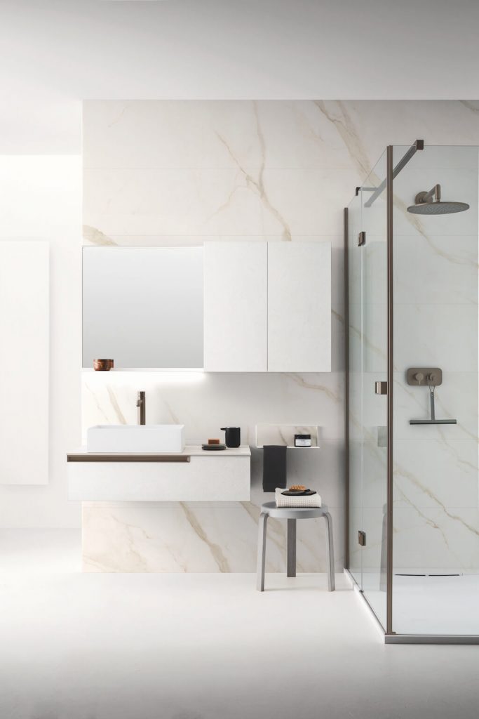 Details become the protagonists, the finishes embellish the elements and the new materials make their entry into the Arblu proposal with the D+ collection.Versatile and functional, D+ is the new bathroom furniture collection, made up of furniture, columns, mirrors and open shelf unit that represents at its best one of the leading Made in Italy company for the needs of the contemporary bathroom.The characterizing element of this collection is the handle. Available in 3 different sizes, it can be positioned in the cabinet where you prefer, to create an aesthetic game depending on whether you place it in the whole door, on the right, left or centre. It can also be customized in the finishes, standard or brushed, and in the new metallic colours: gold, graphite, bronze, silver and black. In addition, these colours can also be applied to taps, to the profiles of the shower cabin and to accessories.Another important novelty, which is presented in the D+ collection, concerns the introduction of the Gres finish. It is a waterproof and resistant material, available in 14 different glossy and matte finishes, applicable to furniture, tops, accessories and walls.Mirrors also play a fundamental role: the round metal Tibò with practical tilting glass, LOL with the possibility of backlighting, Frame in lacquered or painted version.D+ also shows for the first time exclusive and original technical innovations such as the space-saving siphon and Optimus, the internal standard set-up of the drawers, a system organized with practical movable trays that can be moved freely to minimize the unusable space.Last November, Kore shower cabin stood out for its unique concept, representing excellence in creativity, technology and research winning Archiproducts Design Awards 2019. At the source of Made in Italy by Arblu are the skill in working with different but complementary materials like glass, wood, aluminium and new compounds of natural resins such as Pietrablu and Tecnoblu.Arblu began his entrepreneurial career with Pier Giorgio Presotto in 1996 collaborating to date with his sons Giuseppe, Diada and Giovanni. At 1998 headquarter in Roveredo in Piano in the Province of Pordenone, follow the transfer in 2003 to the current plant in Fontanafredda (PN) of 12,000 square meters of covered area structured in 8 functional areas: offices, raw materials processing department, assembly, warehouse, department shipments, furniture department, test laboratories and showrooms. From 1996 until now the company has been the protagonist of constant growth in the proposal of products and services ever more detailed. To the shower cabins and bath screens that characterized the emergence of Arblu in the Italian market in 2006 were joined by multifunction shower cabins and shower columns. 2008 it’s the year of specialization in the shower trays production culminated in 2009 with the coordinated integration of all bathroom furniture.