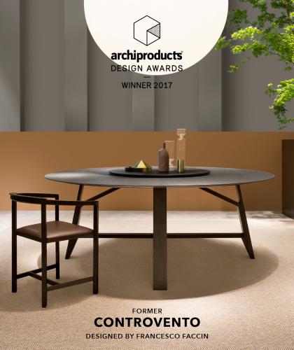 Controvento designed by Francesco Faccin for Former has been awarded by the Archiproducts Design Award 2017 which, at its second edition, wants to celebrate the excellence of international design. The jury, which is composed of 40 of the most important international architectural studios, has rewarded the table as an innovative solution, resulting in distinctive formal and material research. Controvento, designed for the home environment but also ideal for the Contract and Hospitality world, is an expression of contemporary taste. The sophisticated design of the legs, from which the product’s name comes from, is inspired by the backstones used in architecture, stressing the perfect balance between form and functionality, creative foundation of the designer, Francesco Faccin.