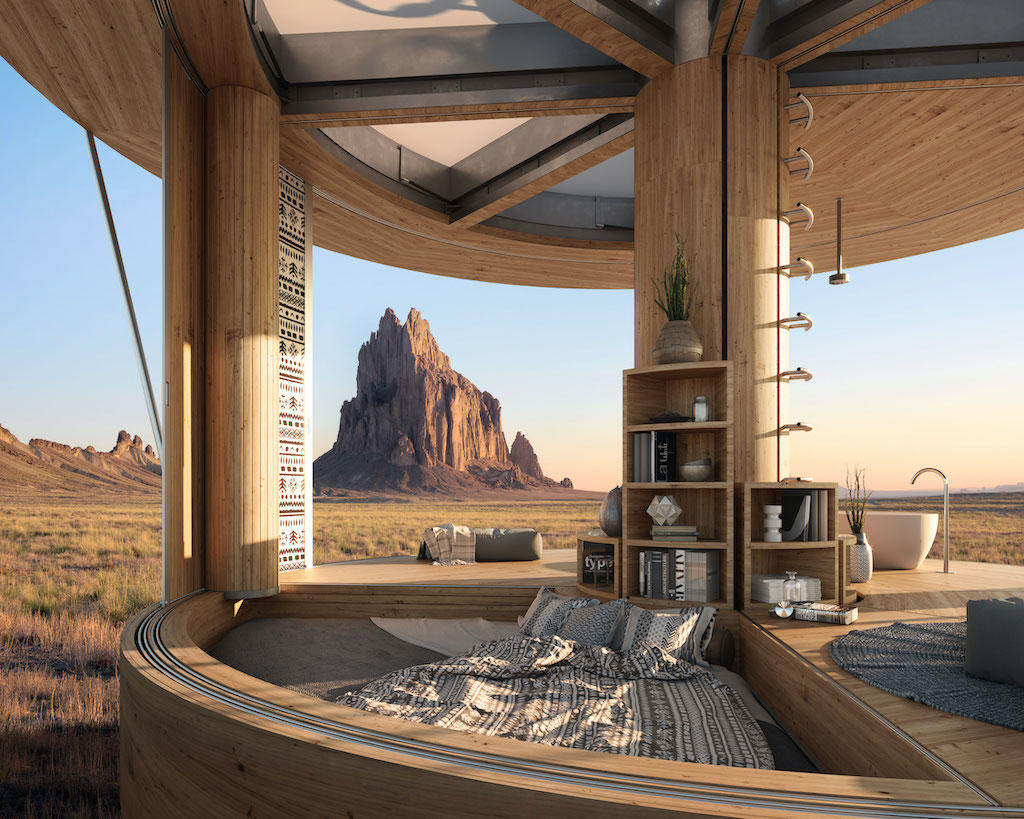 Wake up to the faintest light in the predawn sky overwhelming the last morning star. Climb out of bed, close the hatch and slide open the walls. Roll out your mat to salute the first rays of the morning sun. Brew up a coffee and climb up to the roof. Survey the environment, choose an adventure. Go out, lock up. Return, open, grab a book, doze off in the hammock. Fill the tub, open the dividers, submerge in privacy, refresh. Uncork a bottle, back to the roof. Watch the daylight fade, share thoughts, feelings, aspirations. Crawl down to bed, pull open the hatch, close the walls and dividers. Open the roof panels and count the stars until you lose track.In times of confinement at home due to the Covid-19 pandemic, how many of us dream of such a house?