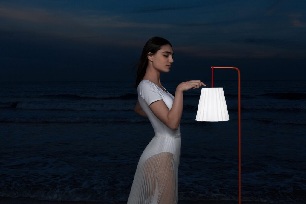 Plisy is like a sort of stylish high-tech reinvention of the garden lantern that features a Led light source with wireless charging. It is produced by Diabla, the third GANDIABLASCO brand with an inspiring attitude that offers creative ideas for new lifestyles.Plisy lamp takes its inspiration not only from the classic shades used for decorative lighting effect but also from the world of fashion, which is why it includes a nautical cord-like handle that makes it easy to carry around like a bag or a wristlet. This mix of influences in the creation of Plisy’s design is not merely coincidental but are rather the favoured inspiration in the work of Alejandra Gandía-Blasco Lloret where other varied personal interests also come into play, everything from the artistic expression of technology to fashion to craft. A homage to pleated fabrics and their application in multiple contexts.As well as all this Plisy is portable and can be hung or placed anywhere, it comes with a pedestal support made from a powder-coated metal rod. Because of that, although designed for outdoors it can easily be placed indoors to help create a soft lighting ambience for dining rooms. Plisy requires 7 hours to fully charge through a USB cable, lasts for 10 hours max., and can be dimmed by simply touching the on/off button.