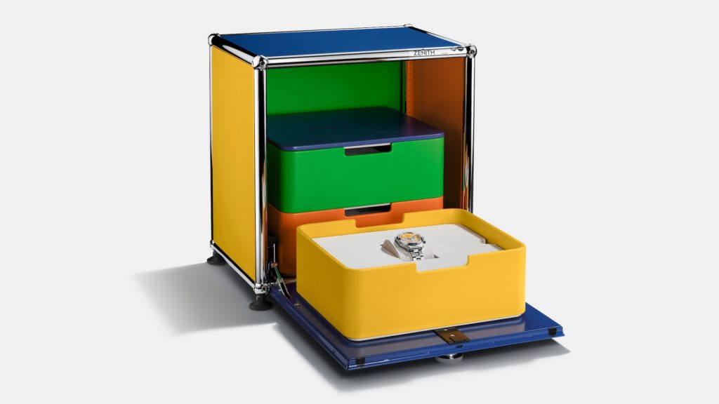 Two icons of Swiss watchmaking and design, ZENITH and USM Modular Furniture, come together to create a collection of timepieces that merges watchmaking mastery with architectural ingenuity Paying tribute to the pioneering spirit of the 1960s—the decade that saw the creation of the USM Haller modular system (1965) and the launch of the revolutionary El Primero chronograph (1969)—this collaboration between two pillars of Swiss excellence comes to life. Inspired by what might have happened if their creative paths had crossed at that time, ZENITH and USM unveil a bold reinterpretation of ZENITH’s original DEFY, now presented in a chronograph version. The result is an exclusive collection of watches that combines horological savoir-faire with architectural brilliance, reflecting their shared values: Swiss precision, meaningful aesthetics, and a vision of modernity that transcends time. Accompanied by a custom case designed by USM Haller, the watch embodies a mutual elevation of horological and modular design—an interplay where each enhances the other. Together, they form a cohesive whole that unites design and precision: this timepiece represents the perfect blend of form and function. More than a collaboration, it is a testament to enduring craftsmanship and forward-looking vision. Conceived to appeal to collectors and Haute Horlogerie enthusiasts, as well as designers, architects and art lovers, the capsule pays homage to creative minds and visionaries across different disciplines. To bring this original collaboration to life, ZENITH and USM immersed themselves in the daring spirit of the 1960s: a transformative era that redefined form and function, marking a pivotal moment in the history of both Maisons. Starting from the question: “What could these two icons of Swiss craftsmanship have created if they had joined forces back then?”, a completely new project was born—a timepiece that did not exist at the time, yet faithfully reproduces the aesthetics and cultural codes of the era. The ZENITH DEFY of 1969 served as the natural starting point for this creative fusion. With its angular case and faceted contours, the bold octagonal silhouette of the DEFY and its fourteen-sided bezel reflect USM’s characteristic design language, which celebrates clarity, structure, and strength. The result is a striking interplay of geometry and surfaces, where every finish reflects the shared values of the two Maisons. Although the original DEFY was released in multiple versions and laid the foundation for today’s DEFY collection, it was never produced as a chronograph. The new DEFY Chronograph USM is, in essence, a piece of “imagined heritage”—an answer to the question: “What if the DEFY of 1969 had been equipped with the innovative El Primero, the world’s first high-frequency automatic chronograph?” And further: “What if it had drawn subtle inspiration from another design icon of the same era, the USM Haller system?” The USM Haller modular furniture system, patented in 1965, has become a cult icon of timeless modernity. Defined by chrome-plated steel tubes, spherical connectors, and colored metal panels, it remains a masterpiece of clarity, versatility, and industrial elegance. Decades later, its ability to evolve and inspire creative expression remains unrivalled—the perfect counterpart to ZENITH’s legacy of precision and innovation. Housed in a compact 37.3 mm stainless steel case that stays true to the bold geometry of the original DEFY, the chronograph features an octagonal shape highlighted by a fourteen-sided bezel, while pump-style pushers enhance its vintage-inspired profile. The watch is paired with the emblematic “ladder” bracelet, originally designed in 1969 by the renowned firm Gay Frères exclusively for ZENITH. Water resistance of 10 ATM ensures robustness consistent with the integrity of the design. The dial features square hour markers with horizontal grooves, reinforcing the watch’s architectural character. The DEFY Chronograph USM is available in four vibrant USM signature colours—green, pure orange, golden yellow, and gentian blue—each edition limited to 60 pieces. The three applied chronograph counters feature a silvery tone with a refined concentric circular finish, adding texture and depth and subtly referencing USM’s signature handle with its bluish rhodium-plated motif. A discreet yet playful detail: the chronograph seconds hand is topped with a miniature USM Haller spherical connector, filled with Super-Luminova for readability in low light. When the chronograph is activated, ZENITH’s star cleverly emerges, a nod to the intricate storytelling woven into the piece. At the heart of the DEFY Chronograph USM beats the legendary El Primero 400 calibre, a direct descendant of the iconic El Primero 3019 PHC—the world’s first high-frequency automatic chronograph movement introduced by ZENITH in 1969. More than 55 years later, it continues to set the standard in precision timekeeping with its 5 Hz high-frequency escapement, automatic winding, and column-wheel chronograph architecture. The mechanism powers the central hour and minute hands, the small seconds at 9 o’clock, the chronograph functions, and the date window at 4:30. The oscillating weight of the movement, visible through the transparent sapphire crystal caseback, is adorned with ZENITH’s open star, flanked by the ZENITH El Primero and USM logos—a refined detail that highlights the harmony between watchmaking and architectural precision. ZENITH Founded in 1865 in Le Locle, ZENITH is one of the first vertically integrated Swiss watch manufacturers. For over 160 years, it has embodied excellence while looking to the future of Swiss watchmaking. Renowned for its pioneering spirit and pursuit of precision, it created in 1969 the legendary El Primero, the world’s first high-frequency automatic chronograph calibre.Today, it stands out through three emblematic collections: CHRON