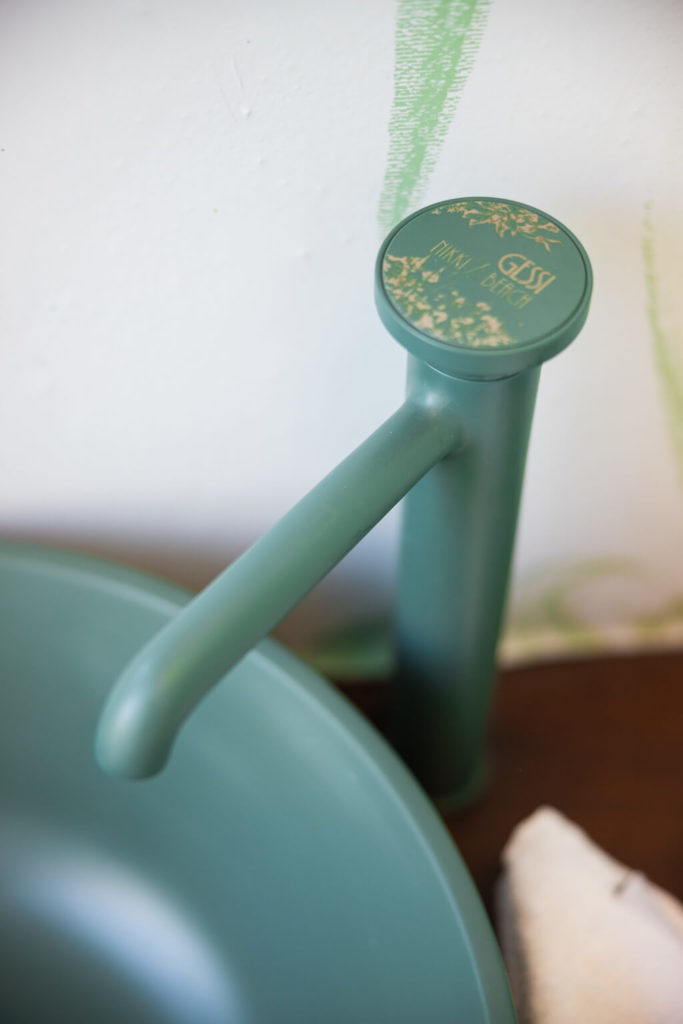 Designed for contemporary well-being, the NATURE (Agave/Brushed Black Metal/Chrome) triad was chosen, reflecting the colour portrait of those who are regenerated by contact with nature. Evocative of the sea waters of the Costa Smeralda, the particular shade of green takes on a symbolic meaning to open horizons and move the bathroom outdoors.