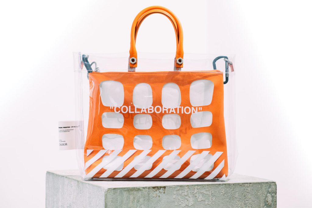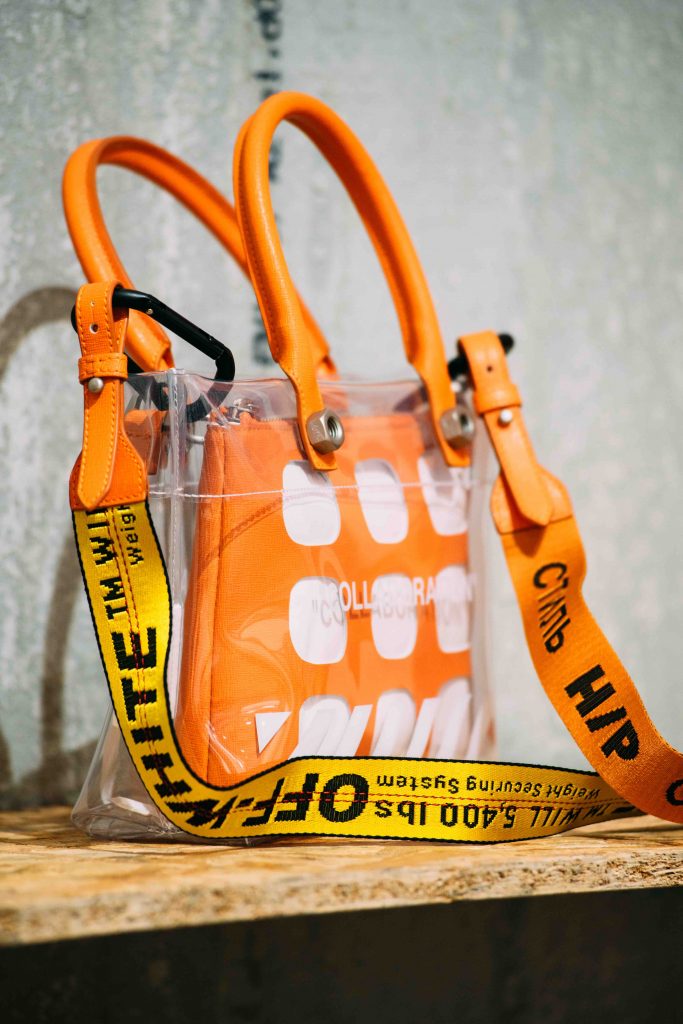 Available in two sizes, COLLABORATION is a living hybrid: its dual-coloured strap is a fusion of Off-Whites graphic yellow Weight Securing System strap and Preston’s signature orange band with the branded word “Style” in Russian. The strap is a purposeful note of asymmetry in a piece with clean balance. The transparent body is printed with Off-White’s famed diagonal white lines, along with the words COLLABORATION. Black carabiner clips secure the strap, while inside, an industrial netting-inspired inner tote is a textural contrast to the sleek exterior. Substantial industrial hardware finishes the design, with metal nuts that cleanly secure orange leather straps.