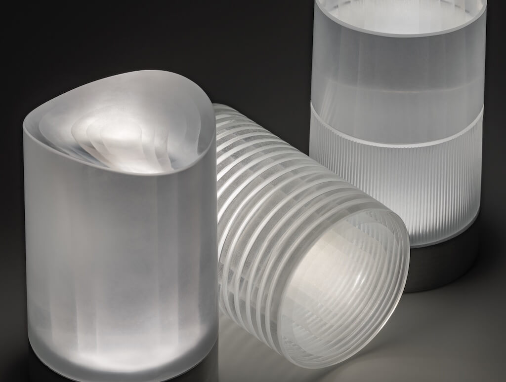 The two new lamps insist on the research started by Peri around the theme of glass engraving. Ribbons, pleats, millerighe excavations cover the surfaces of these two lamps, refining their cylindrical shape and giving life to three different models: Silk, characterized by a ribbon that culminates in the slightly concave upper surface, Doll, composed of a smooth half and a half-covered by thick knurling, and Stripe, covered by thick horizontal stripes. The collection is made even more precious by the three chosen colours: crystal, smoked, rosé.