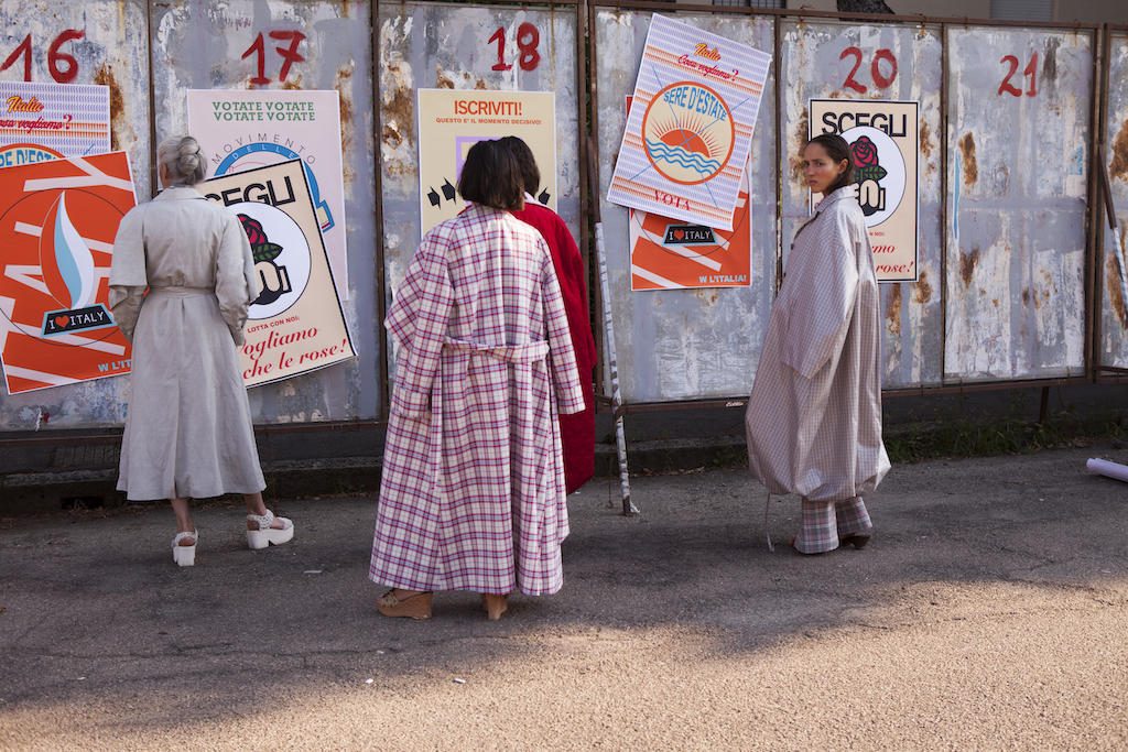 The sense of bourgeois agility mingles with an idea of contemporary streetwear: floral crêpe dresses and overcoat waxed check cotton, transparent silk with very thin stripes and k-way in nylon, coloured popeline and men’s drape jacket weights.A different but coherent universe that tells a story of criticism today but also describes a scenario of acceptance, understanding, overcoming limits. More and more necessary.