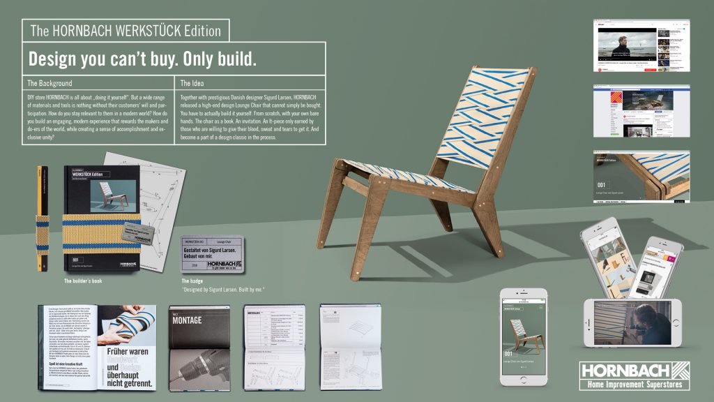 Among the 27 winning works awarded “Gold” at the 27th ADCE Awards organized by Art Directors Club of Europe at Disseny Hub, Barcelona in November 2018, in Graphic Design category the winner was “Hornbach Werkstück Edition 001” by German Heimat Berlin.The Werkstück 001 Lounge Chair was designed by Danish designer Sigurd Larsen for do-it-yourself superstore chain Hornbach. He created a design it-piece that cannot simply be bought. Instead, it can only be built. From scratch. With nothing but your bare hands. Reaching peak exclusivity, the chair made strictly of materials out of Hornbach’s vast product range is a tribute to their customers own capability, realized through the dedication of true DYI-ers. Berlin-based Sigurd Larsen is an architect working within the fields of architecture and furniture design. The work of the design studio – founded in 2010 – aims to combine the aesthetics of high-quality materials with functional concepts for complex spaces. Sigurd Larsen has designed furniture for various German, Danish and American design companies that are sold worldwide. A large number of furniture pieces are available in the formelA stores in Berlin and Copenhagen. During the 16th Architecture Biennale in Venice, he exhibited two projects all made in wood in the European Cultural Center Palazzo Mora. The topic was sustainable housing in densely populated cities and user interaction. Sigurd Larsen has a master degree from The Royal Academy of Fine Arts, School of Architecture in Copenhagen and previously been employed at OMA-Rem Koolhaas in New York, MVRDV in Rotterdam and COBE in Copenhagen.