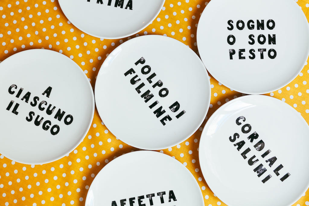 Close your eyes, MAKE A DISH! è il nome dei nuovi prodotti di Mani in Pasta Lisboa, il progetto di Food Design sociale fondato dalle architette Elisa Sartor e Valentina Toscano: “Il nostro obiettivo è somministrare la giusta dose di design della parola e artigianato contemporaneo generando connessioni sociali tra chi usa le nostre borse, le T-shirt, i grembiuli ed ora anche i piatti e chi li legge”. Una collezione per la tavola di tutti i giorni di alta qualità, prodotta in collaborazione con SPAL, azienda portoghese di porcellane che fin dalla sua fondazione promuove il design, l’innovazione e la qualità come parte della sua filosofia essendo la prima azienda del settore a lanciare un concorso di design nel 1970. Italian Design Made in Portogalllo, la collezione è divertimento locale 100% garantito!La Collezione 2019 si compone di una serie di sei piatti (diametro: 27 cm), lavabili in lavastoviglie, realizzati in porcellana che riportano succulenti giochi di parole legati alla tradizione culinaria italiana: AFFETTA E SPERA CORDIALI SALUMI A CIASCUNO IL SUGO SOGNO O SON PESTO ALICI COME PRIMA POLPO DI FULMINE Ognuno può scegliere il suo set preferito, ma ci sono anche set di due piatti suggeriti: APPETIZER Combo (AFFETTA E SPERA / CORDIALI SALUMI) PASTA Combo (A CIASCUNO IL SUGO / SOGNO O SON PESTO) FISH Combo (ALICI COME PRIMA / POLPO DI FULMINE) Shop online: http://www.maniinpasta.co/piatti/make-a-dish-antipasto-set-of-2 http://www.maniinpasta.co/piatti/make-a-dish-pasta-set-of-2 http://www.maniinpasta.co/piatti/make-a-dish-pesce-set-of-2 Oppure il set da sei: AFFETTA E SPERA + CORDIALI SALUMI + A CIASCUNO IL SUGO + SOGNO O SON PESTO + ALICI COME PRIMA + POLPO DI FULMINE Shop online: http://www.maniinpasta.co/piatti/make-a-dish-set-of-6-1 All Rights Reserved 2019 Mani in Pasta Lisboa