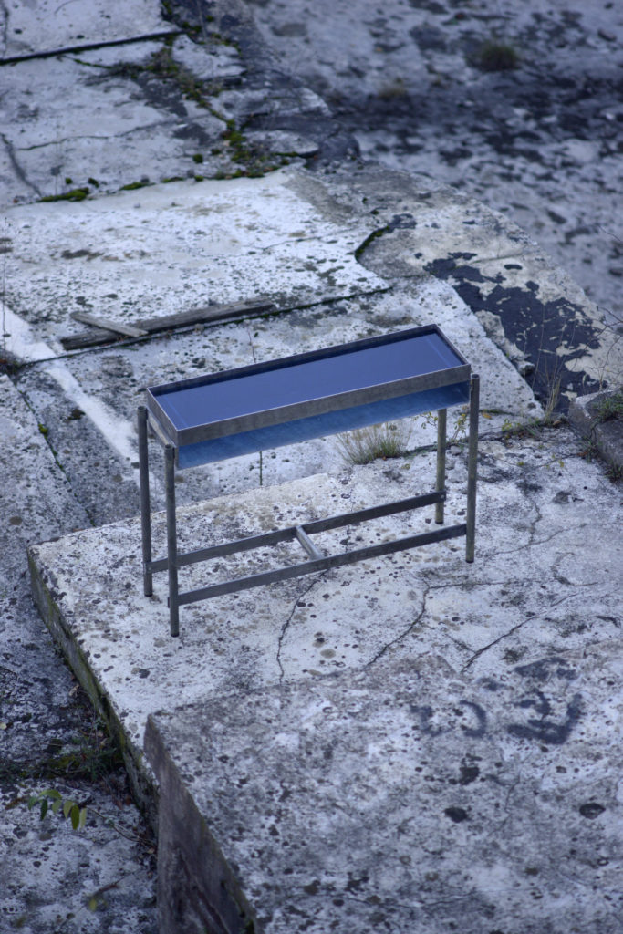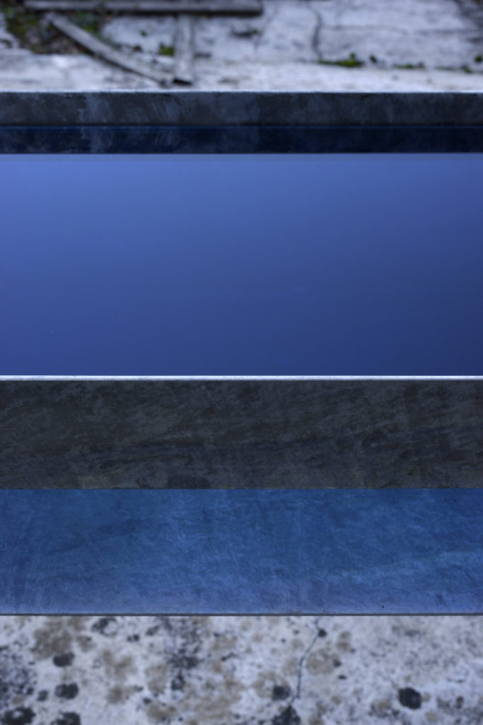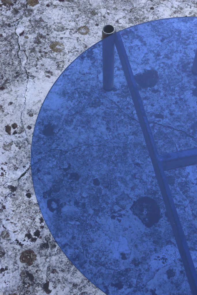I piani sono in vetro trasparente blu mare. La luce li attraversa e colora le strutture, vira le irregolarità cromatiche sui toni freddi. Sembrano oggetti ancora immersi nel mondo subacqueo.