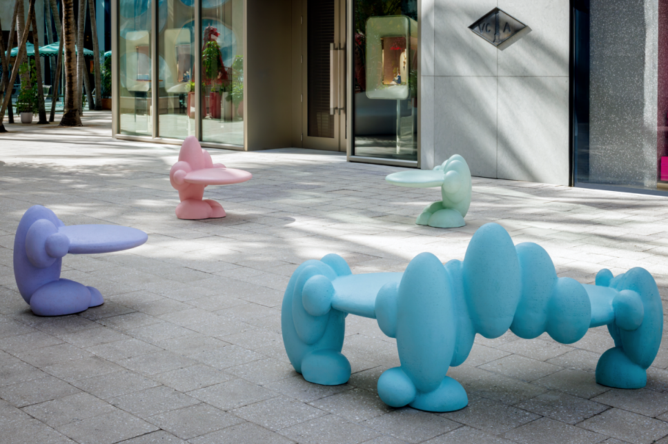 Dipinti a mano nelle vibranti tonalità pastello del pistacchio, dell’acqua, della lavanda, dei fiori di ciliegio e del blu guscio d’uovo, i progetti di Bohinc rendono omaggio alla tavolozza dei colori architettonici di Miami e apportano elementi di giocosità, funzionalità e comfort alle aree esterne che le installazioni abitano.