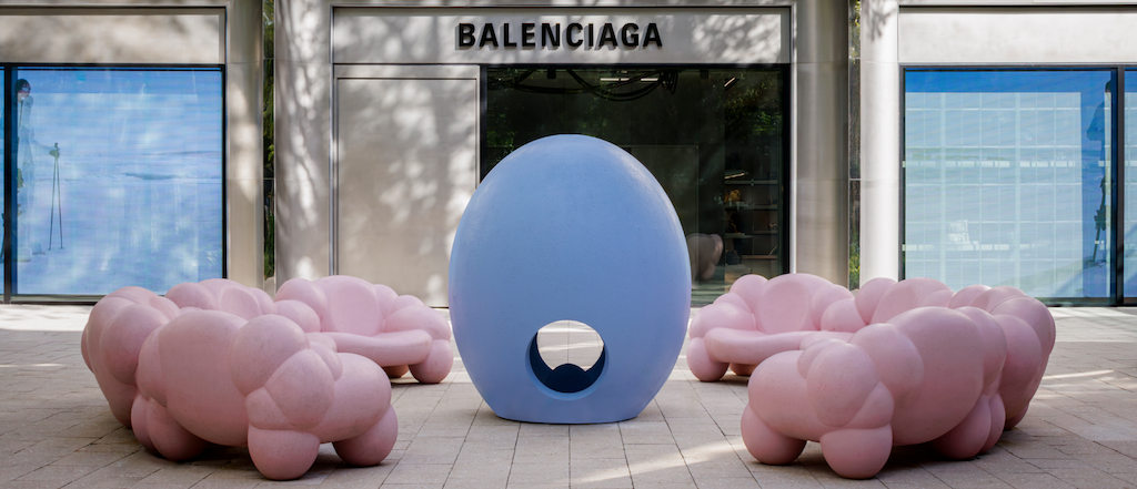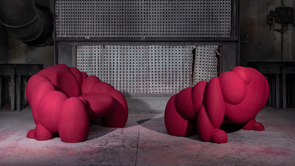 L’installazione di fronte alla mostra Design Miami presenta i divani a tre posti Synchronicity in color corallo, le poltrone Utopia in lampone, il tavolino Beginning in ciclamino e il tavolino Friends in rosso pomodoro. Amichevoli e dinamiche, le sculture sono suggestive come oggetti viventi e si diffondono nel quartiere con la loro presenza gentile e misteriosa.