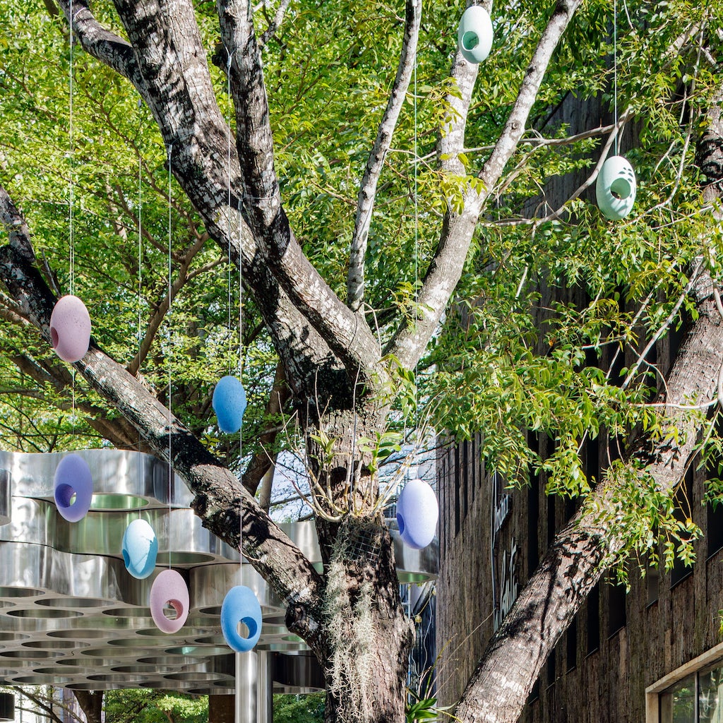 Una costellazione di novecento casette per uccelli a forma di uovo è disseminata tra i rami degli alberi, fornendo un rifugio colorato e un’ombra per la fauna locale. Facendo eco alla funzione delle casette per uccelli, una gigantesca forma di uovo alta due metri al centro dell’edificio è invece un rifugio giocoso per i bambini più piccoli.