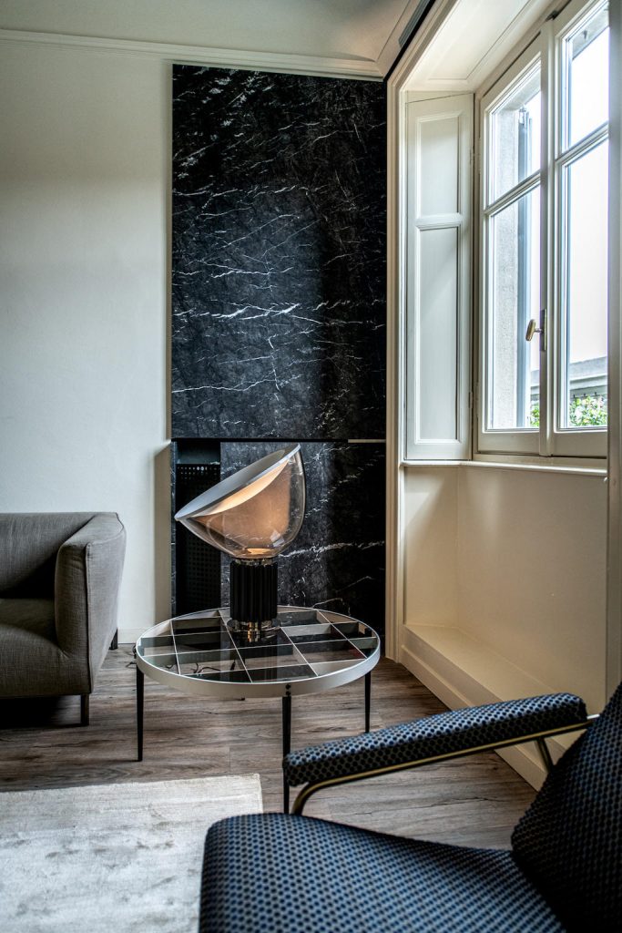 Il nuovo progetto si propone di seguire il carattere del precedente, ovvero, reinterpretare il lusso discreto, da sempre elemento distintivo dei salotti milanesi. Il risultato è uno spazio modulato da grandi superfici a pannelli che modificano la geometria ma senza stravolgere l’impianto murario originario. Superfici pensate giustapponendo materiali diversi, a volte in contrasto. “E’ un retaggio tipicamente milanese quello di saper ponderare ed osare: nel lusso questo equilibrio è tutto. L’accesso all’attico dichiara da subito il principio che ha guidato l’intervento sugli interni: il contrasto tra antico e moderno e lo shock materico delle finiture. Infatti le superfici verticali, rivestite in ferro nero fanno da contraltare al vano scala ascensore decorato in modo classico. Le superfici a specchio, completano la fusione” afferma Niccolò Menichini.