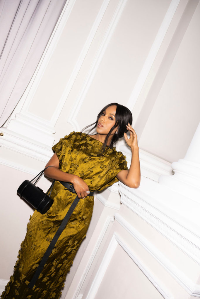 Kerry Washington wore a cactus crushed duchesse sheath dress by Michael Kors while out in London, UK, on Saturday, December 14, 2024.