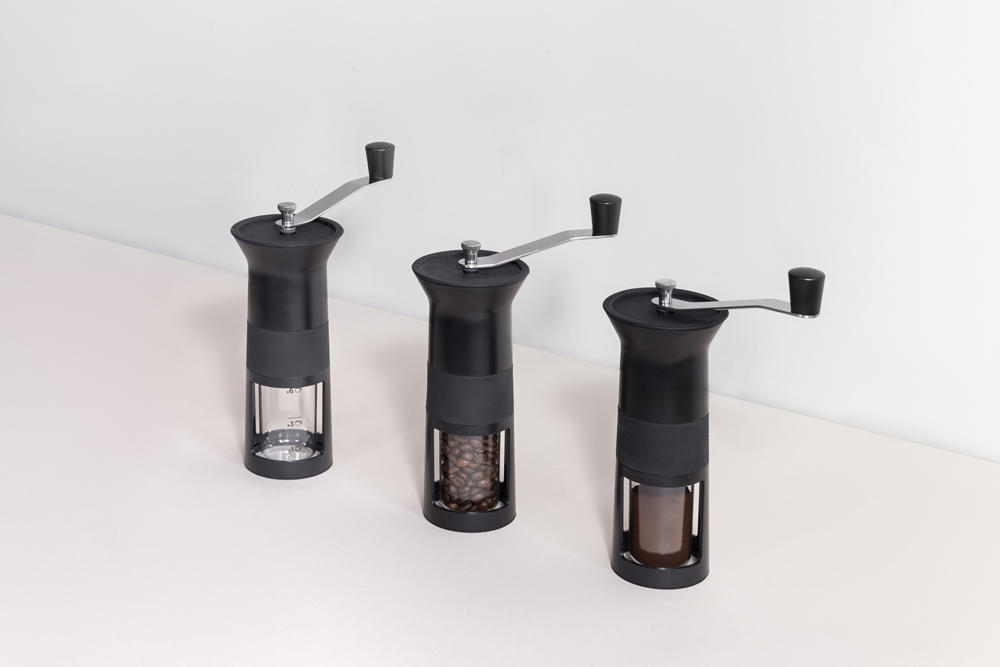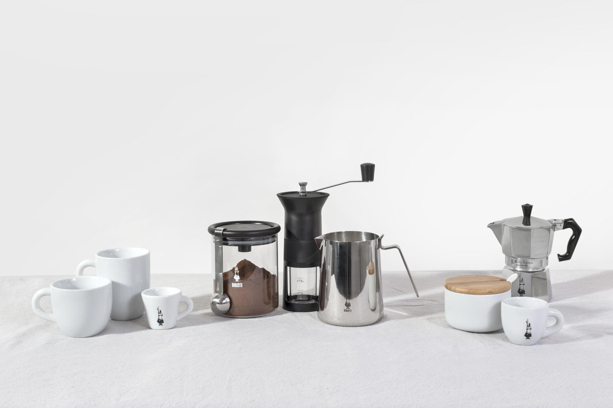 The coffee grinder is equipped with adjustable ceramic wheels to avoid overheating the beans and gives the chance of choosing the desired fineness of the powder. The transparent dispenser measures the amount of coffee for 1, 3 or 6 cup moka pot. The silicone lid allows you to fill the coffee grinder quickly without spreading the powder. The stainless steel jug is available in different sizes to always manage to the best the temperature of the milk for your cappuccino. The shape of the handle is designed to protect the thumb from high temperature and the spout has been designed to cut the liquids and never spill a drop.The glass coffee jar hides a big innovation underneath a support to house the moka funnel at the time of filling. This trick is to have your hands free and to accommodate the excess powder inside the lid and then empty it into the jar without getting dirty. The shape of the spoon is designed to accurately measure the powder and when not in use it will hook on the lid with elegance.
