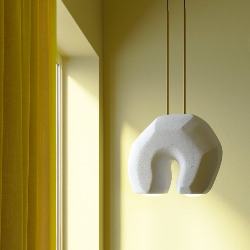 The lamps emit a soft, down-streaming light flow, whilst their opaque, faceted silhouettes become sculptural when teased by rays of light. As a voice of the daydream shaped into sculpted spaces, Moonstone evokes moonlight poetry in our daily life.