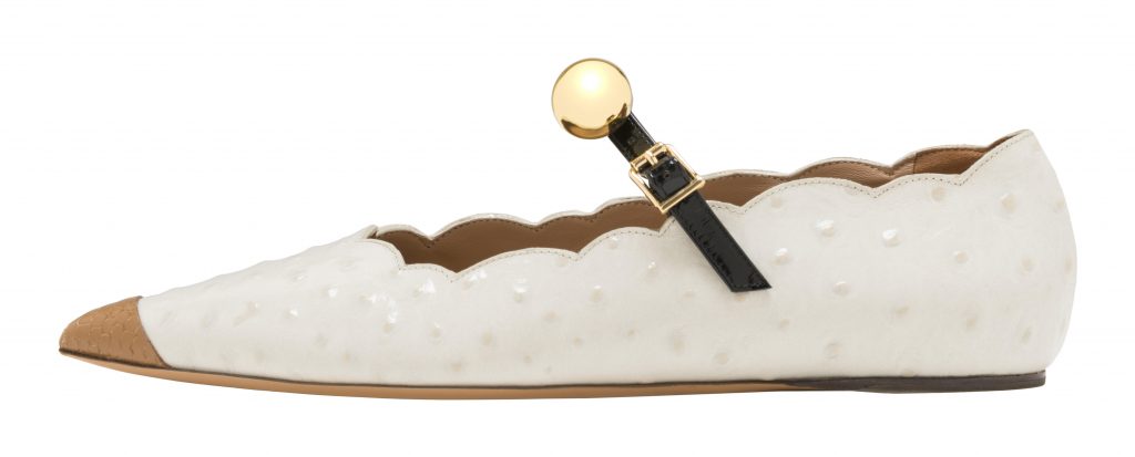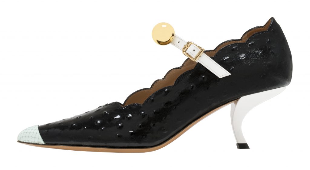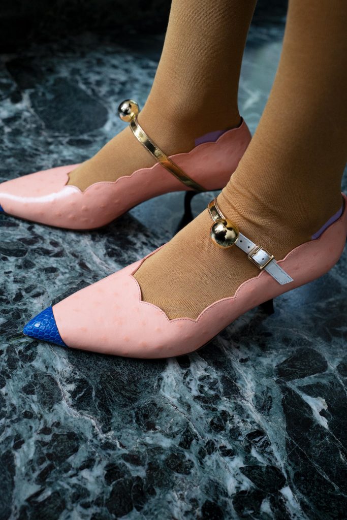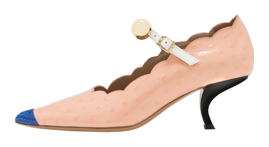 A charming reinterpretation of the Mary Jane, the shoes are presented in a delicate ostrich-print calfskin model that features a tapered design with a contrasting python-print leather toe. The upper has a fun cloud-like profile and stands on a medium-length brushed metal heel with the distinctive comma shape. The powder pink version has an electric blue toe, while the more classic black version has a white toe. There is also a flat variant of the new Mary Jane, which comes in a beige shade with a tobacco-coloured toe.