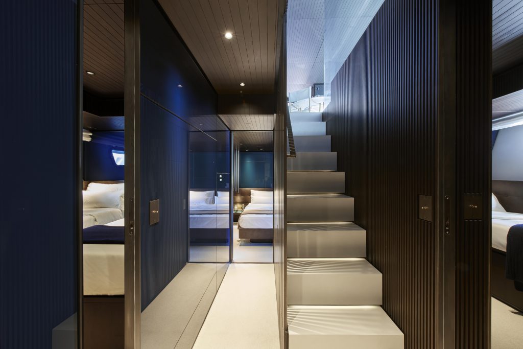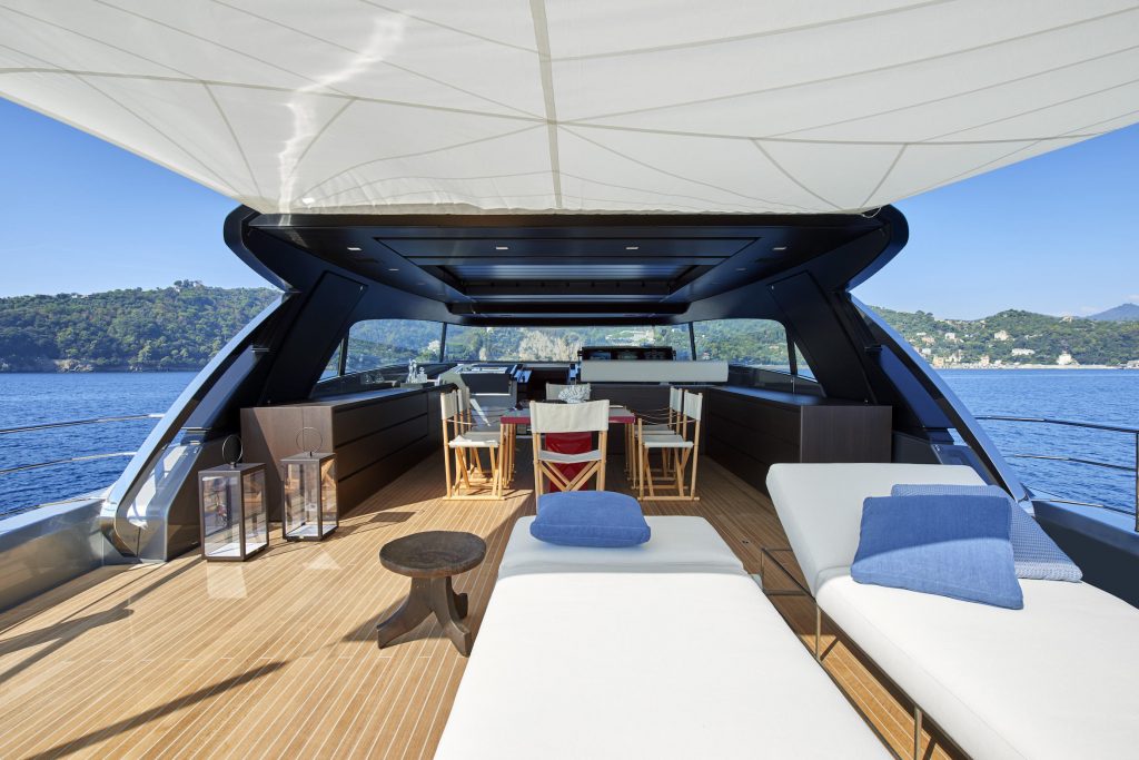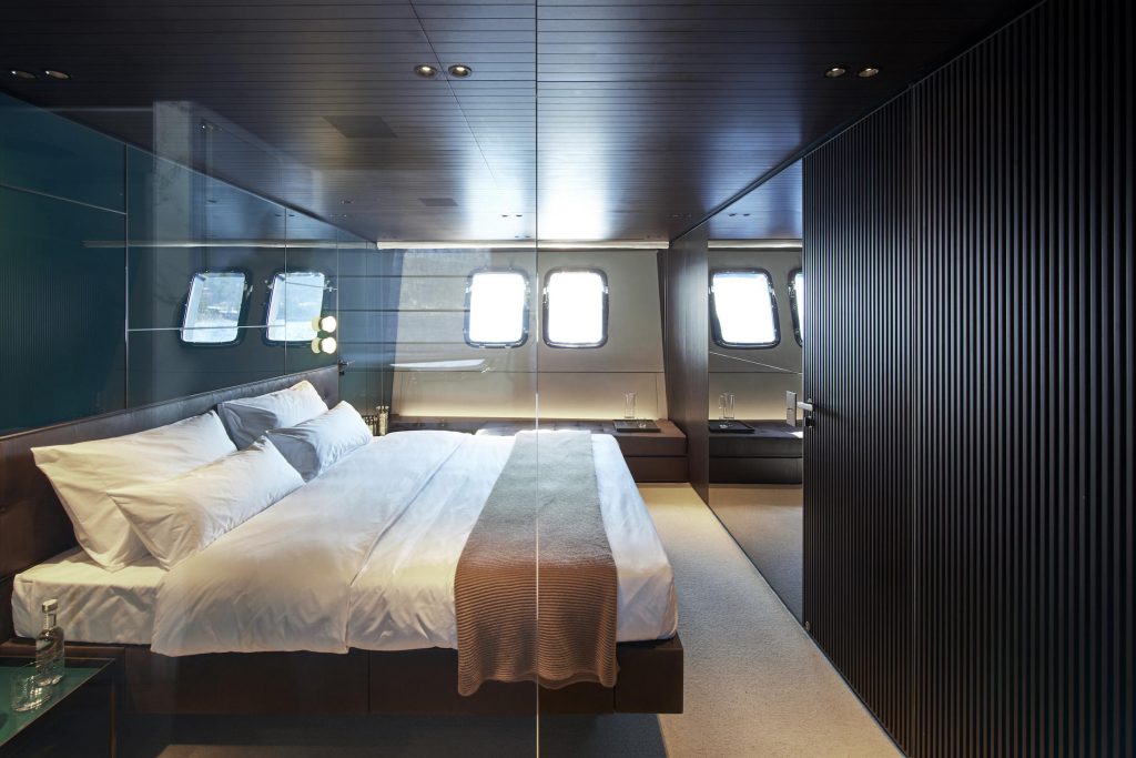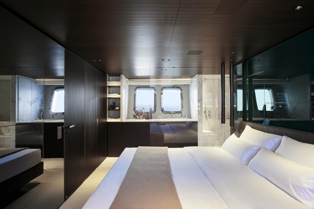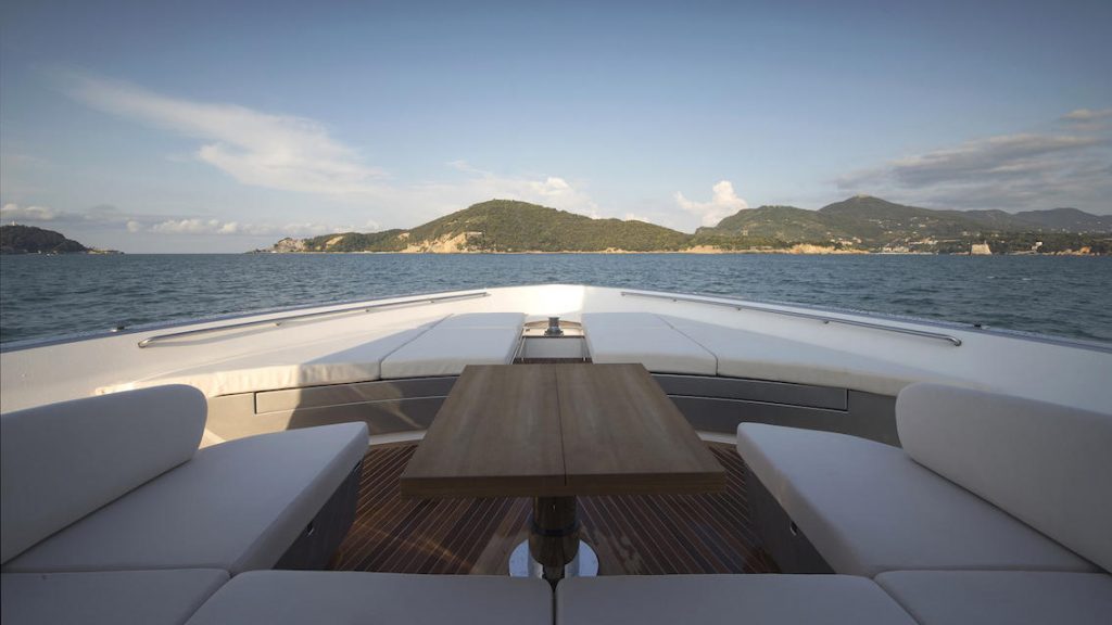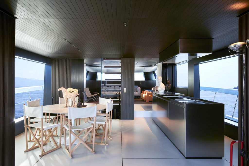 All the main deck is spreading on the same level and can be opened – according to the different layouts – from stern to bow, creating a true open space loft, a never seen before feature on a 27m.By using a totally innovative solution, Piero Lissoni re-interprets the concept of space inside the boat, which develops in a single, continuous setting from stern to bow, with an open kitchen, beside the dining room, followed by a living area with no interruptions between interiors and exteriors, thanks to wide glass walls facing the sea: “I keep picturing boats, even very large ones, as if they were lofts, that is very open, highly liveable spaces, which make it possible to be in contact with what’s around us”.