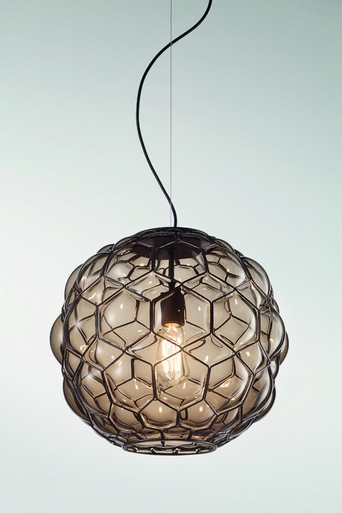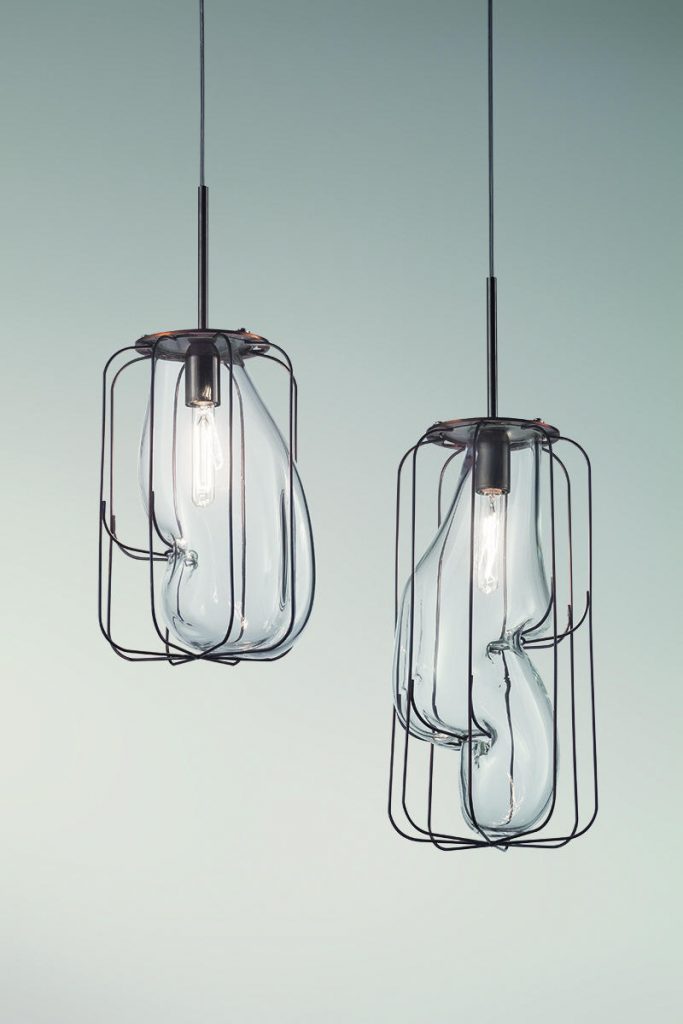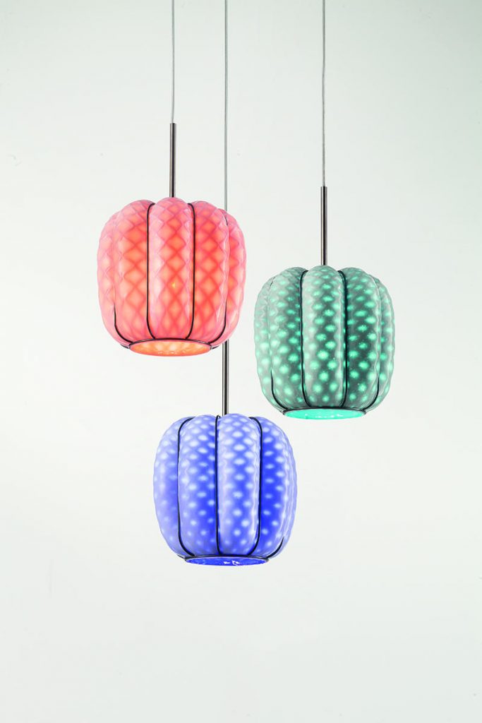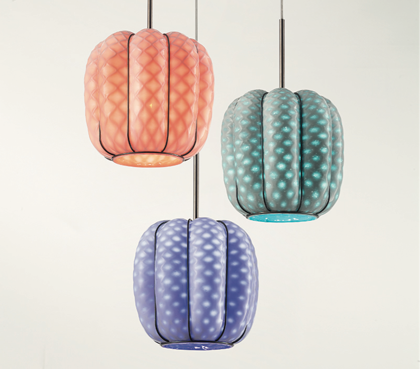 At the appointment with Light+Building 2018, Siru attended the event showing new products created in cooperation with international designers, able to re-elaborate the traditional concept of glass blowing production. Thanks to the experience and knowledge in techniques and craftsmanship arts of his founder Rudy Marinotto, Siru keeps having a rash attitude towards experiments in the employment and processing of glass, in order to get a highly customized production. The glass, a modular material that leaves space for creativity, has given rise to a huge range of shapes, finishes, colours, decorations, which define the uniqueness of the products. Since 1989, Siru is able of melting the operational and contextual needs that are typical of a company with the natural tendency of considering itself as a “research workshop” rather than an industry in common meaning. From this definition, Siru derives his tireless fervour in making research and experiments. New combinations of colours, surfaces, textures, metal cages create objects of undoubted worth, completely unrelated to the serial mass production. The DESIGN and GLASS collections have been enlarged by 8 new glass products, according to the most ancient Murano artisan traditions of blowing glass and with the aid of wooden moulds or metal cages created by famous designers. Inside Pause designed by Gumdesign the liquefied glass drop broadens by glassblower continues to transform its shape taking changeable ways. The elegant and timeless shape of the Cloche lamp, designed by Kanz Architetti, is part of our ancestral memory, while the decreasing rhythm of the metal rings, based on Fibonacci’s numerical sequence, brings its verticality back to the genuine pleasant proportions of the golden section. The Cage project starts from the experience of Odoardo Fioravanti in the design of industrial products and his passion for classic outdoor lamps with protective cages. Hence the thought to blow glass into structures which allude to those forms and could domesticate the aesthetic, bringing it inside the houses. Organic shapes are a constant source of inspiration because they often show the most obvious solution to a structural problem. The caged glass is all about surface reticulation, like shells that may be a valid example. Specifically, in turtles, shells reticule are quite similar to the metal cage, a more rigid frame under which the rest of the shell expands. Galapagos designed by Giorgio Biscaro follows exactly the same generative approach, starting from a simple hexagonal shape, then expanding it parametrically and wrapping the whole pattern into a very basic solid, a simple sphere like the curved and almost spherical shells of testudo turtles. In the Rudy Marinotto’s Nest project the milky white shell and pastel colours are hidden in the surface worked with baloton technique, which is noticed only when the light is on. A magic lamp, in which the initial shades blend in a single colour stain. Coloured and elegant, the Faro project by Rudy Marinotto reflects the light where necessary through the baloton surface of the glass and transmits its texture, spreading bright effects outside. A rounded coloured metal head emphasizes its shape. The pendant lamp Suona designed by Büro Famos aims to interpret Venetian glassmaking tradition in a contemporary way. Different finishes and surfaces of the monochrome glass create intriguing beauty, a discreet highlight in every environment.