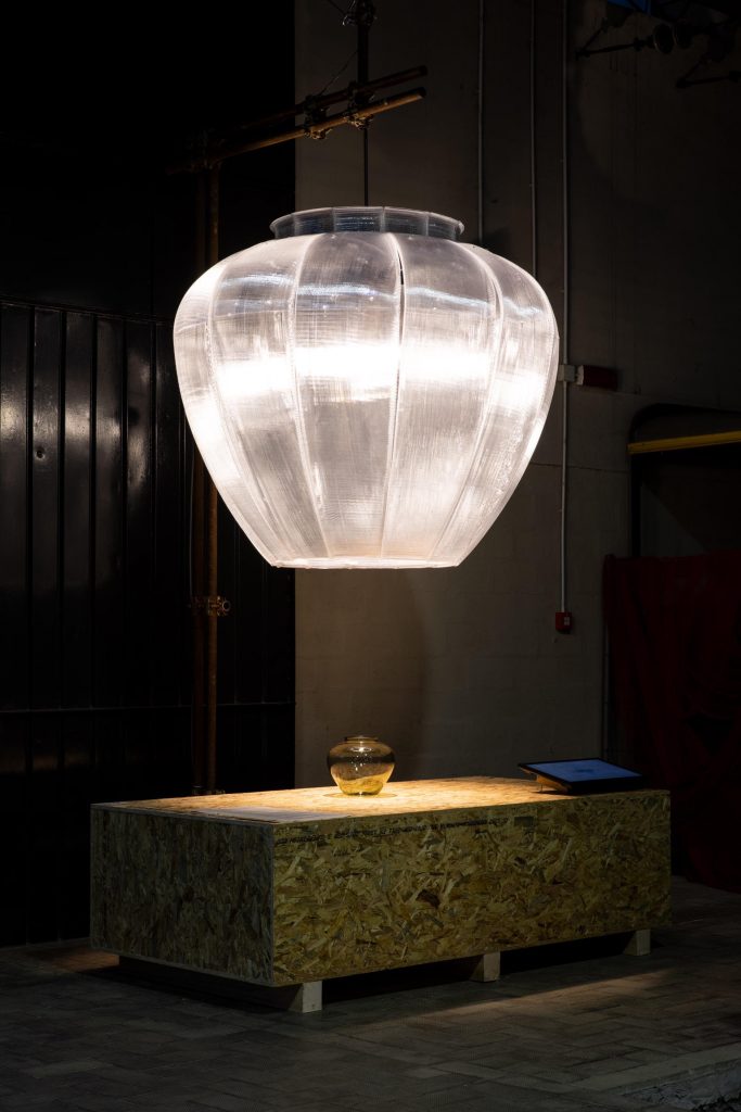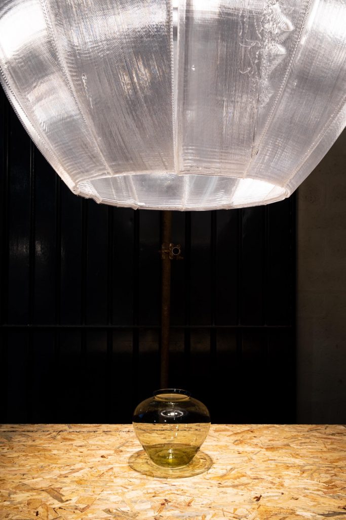 The architect thus started out from a Wagenfeld glass vase of 1935 and transformed it into an imposing, man-sized pendant lamp. During the exhibition, the lamp illuminated the original vase – part of Tiziano Vudafieri’s personal collection – to highlight the relationship between inspiration and work.