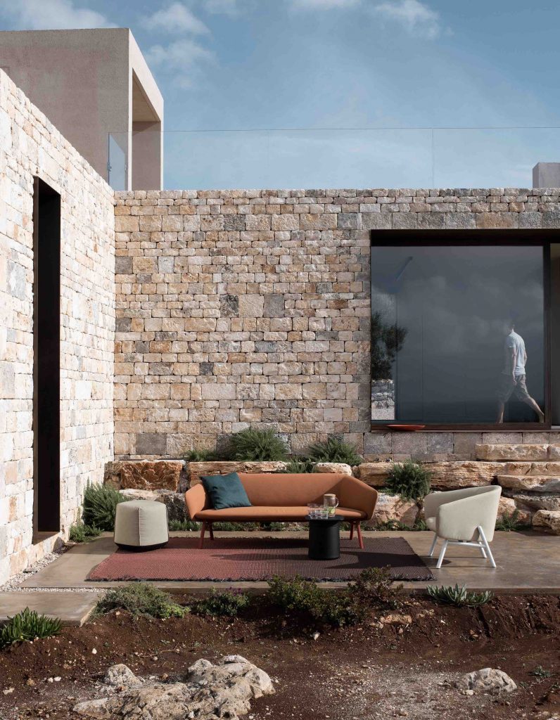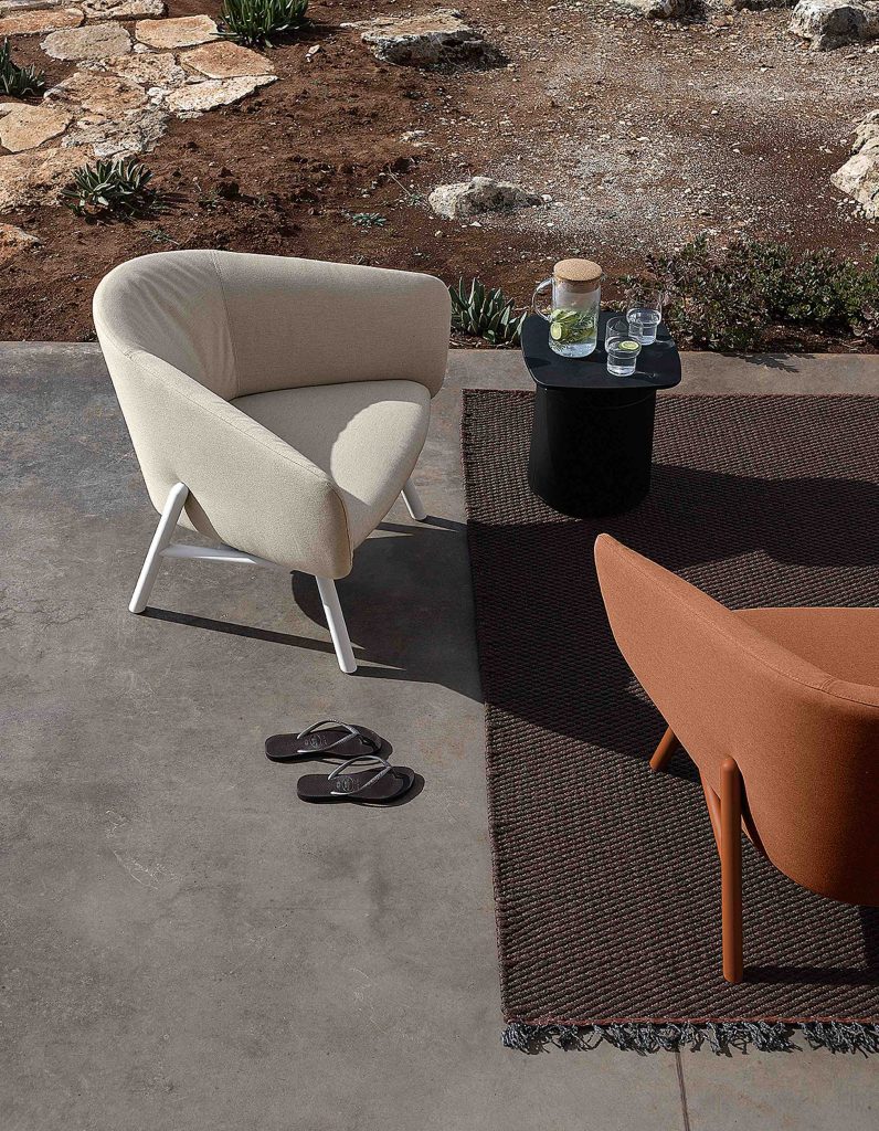 Designed by Patrick Norguet for Kristalia, Tuile upholstered items take their name from the shape of the backrest and armrests reminiscent of the French biscuit of the same name. The style recalls homely atmospheres but they are made of materials specifically designed for outdoor use. The collection includes a 2-seater sofa, a 3-seater sofa and an armchair. The frame is made of sturdy metal with anti-corrosion treatment and powder coating. Comfort is guaranteed with soft polyurethane foam padding, with a metal insert and straps, enclosed in a waterproof covering. The upholstery is made of Sunbrella® fabric: stain-resistant, breathable, resistant to UV rays and water-repellent.