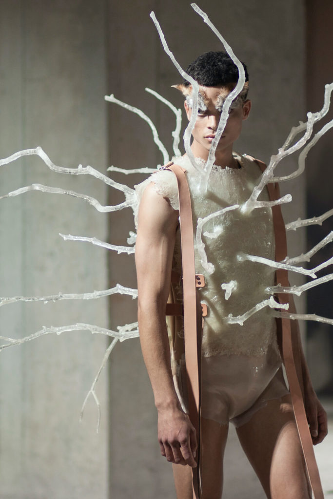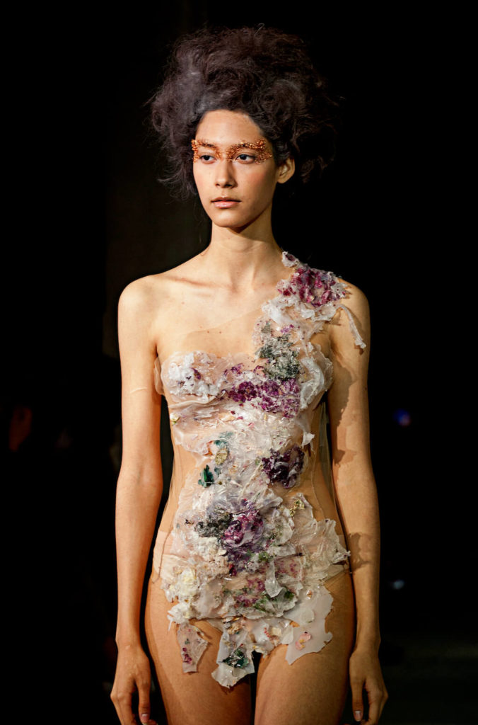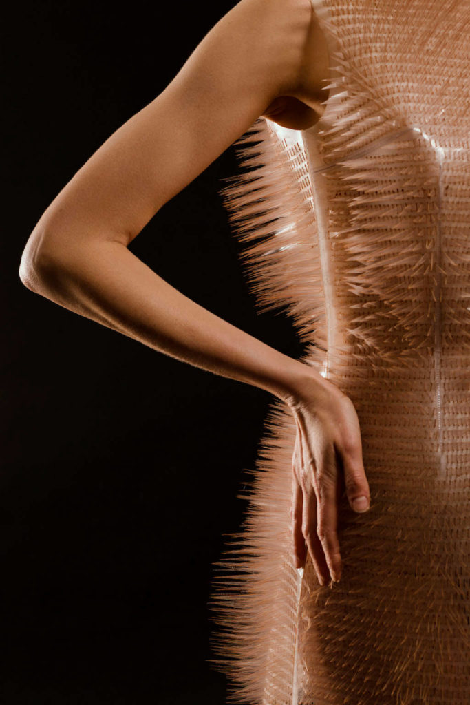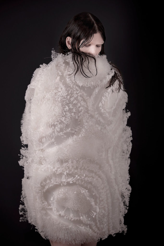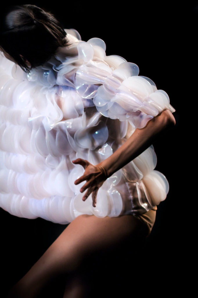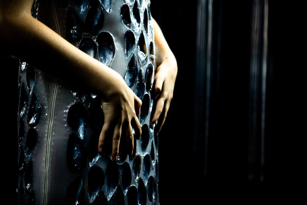 Biomanufacturing and craftsmanship in fashion by artist, fashion designer and architect Raquel Buj exhibited in ILE Institución Libre de Enseñanza during Madrid Design Festival 2023 Founder and director of BUJ studio, an experimental design fashion lab, Raquel Buj is an artist, fashion designer and architect. We discovered her on the occasion of Madrid Design Festival 2023 in ILE Institución Libre de Enseñanza. She designs body envelopes, and second skins that are made with materials brought and reformulated from very diverse fields mixed with digital manufacturing and biomaterials. Raquel Buj conceives her studio as a laboratory in which to experiment with new materials, combining craftsmanship and technology in the development of her pieces. Raquel comes to fashion through architecture, interested in reducing the distance that separated her ideas from her own body, in search of a scale that would allow her to manage each part of the process. She conceives design as body architecture, she does not speak of garments but of “envelopes” whose materials are an extension of us, entities with which we relate and with whom we must feel empathy because they are “the most immediate way of expressing ourselves“. Clothes are ahead of language, they are faster and more direct. Therefore, she tries to end the idea of fashion as something superficial. Her creations respond to a zoomorphic or post-human aesthetic and her research into technology and new materials allow her to produce in an increasingly sustainable way. Her line of work moves towards research with new materials from biomanufacturing and recycling, from the combination of craftsmanship and technology in order to create new materials that are more sensitive to the environment that surrounds us. Working meticulously on what is neither seen nor wanted, mixing it with other materials and technologies, it is possible to give value to what is there but we cannot see it and transform it into something beautiful. A practice that, ultimately, allows us to generate a new material culture that takes charge of the fragility of the environment in which we live. Her work receives various awards and recognitions, among which the Samsung Ego Innovation Project (2017) MBFWM award and the mention for Research and Design of the Ibero-American Design Biennial BID 19 (2019) or the IADE 2021 emerging design award stand out. She combines her professional practice with her teaching practice as a professor of new materials in fashion at the URJC, the IED and the BAU and gives various workshops and talks nationally and internationally such as TEDxMadrid 19, Retrofuturo. She has been a jury member at the RESHAPE Forum Barcelona 2019. Her pieces have been exhibited in various centres and galleries such as the Casa Encendida 2020, the Riu de Plaza de España 2021, the Manuel Piña Museum 2022 or the Can U sustainable exhibition in Shanghai, China 2022. She has collaborated with various artists such as Janet Novás for Veranos de la Villa 2019 or the Stocos Institute for the Royal Academy of Spain in Rome. Her work has been published in various media such as Vogue, Yorokobu, El País, Neo2, Metal Magazine or A*desk. She has recently been awarded by the Spanish Academy in Rome 2022-2023 where she develops a project between art, fashion and biomaterial research.